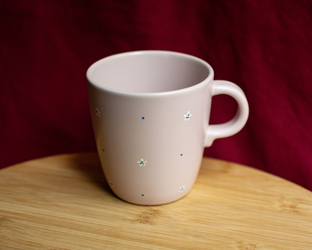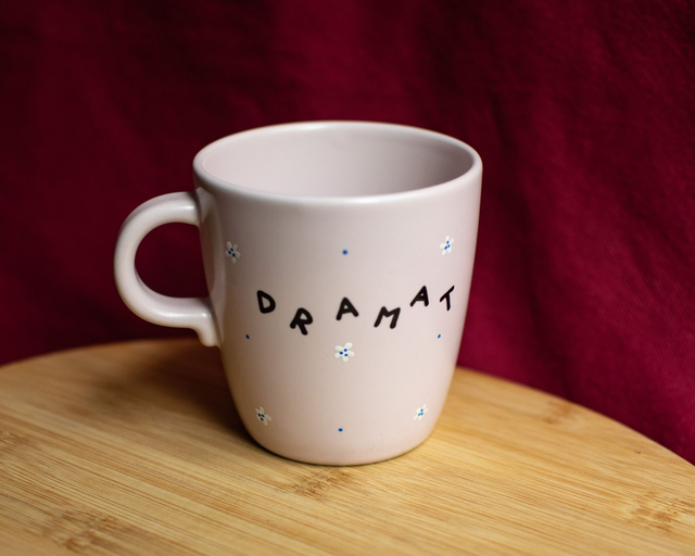 Ręcznie malowany różowy kubek z drugiego obiegu. Ozdobiony czarnym napisem DRAMAT oraz biało-niebieskimi kwiatkami i niebieskimi kropkami.