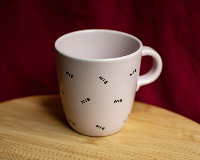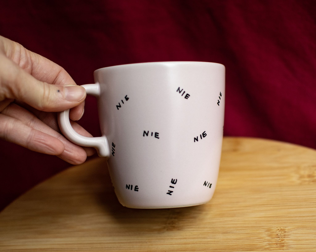 Ręcznie malowany różowy kubek z drugiego obiegu. Ozdobiony wieloma czarnymi napisami NIE.
