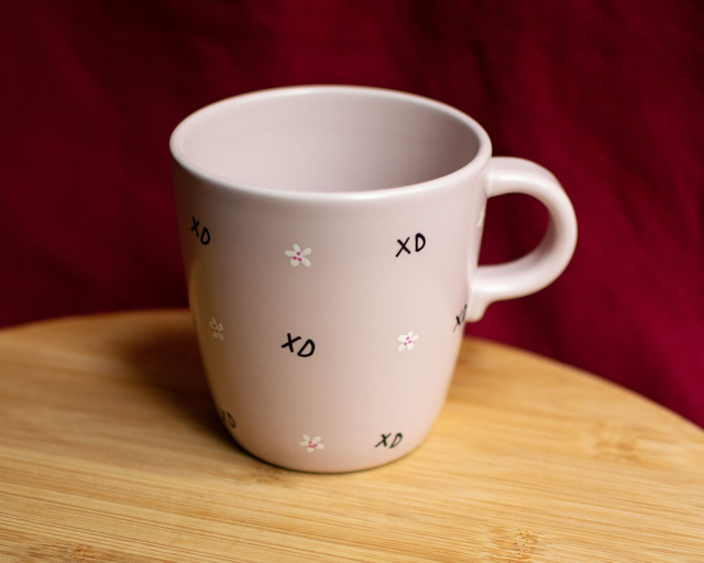 Ręcznie malowany różowy kubek z drugiego obiegu. Ozdobiony napisami XD oraz biało-różowymi kwiatkami.
